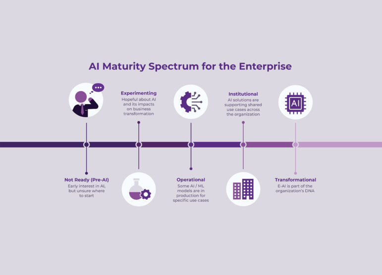 EK’s proprietary AI Maturity Benchmark helps our clients discover where they stand, and we work with them to build a customized strategy and roadmap for reaching their goals. Our proven framework allows any organization to understand their level of AI literacy and create a strategy for operationalizing AI at scale.